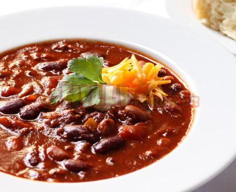 Na pánvi si rozpálíme olej, přidáme cibuli a česnek a pražíme dokud cibule nezesklovatí. Přidáme mleté maso a opečeme ho, aby mělo ze všech stran bělavou barvu. Přidáme k němu fazole, rajčata, vývar, chilli papričky , osolíme a opepříme. Na mírném ohni vaříme asi 45 minut. Na závěr můžeme posypat sýrem a petrželkou.